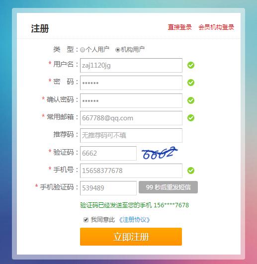 2.选择网站用户类型为机构用户,输入用户名、密码、常用邮箱等带*的必填项,短信验证手机,勾选《注册协议》,点击立即注册。机构网站用户注册成功。如下图所示: