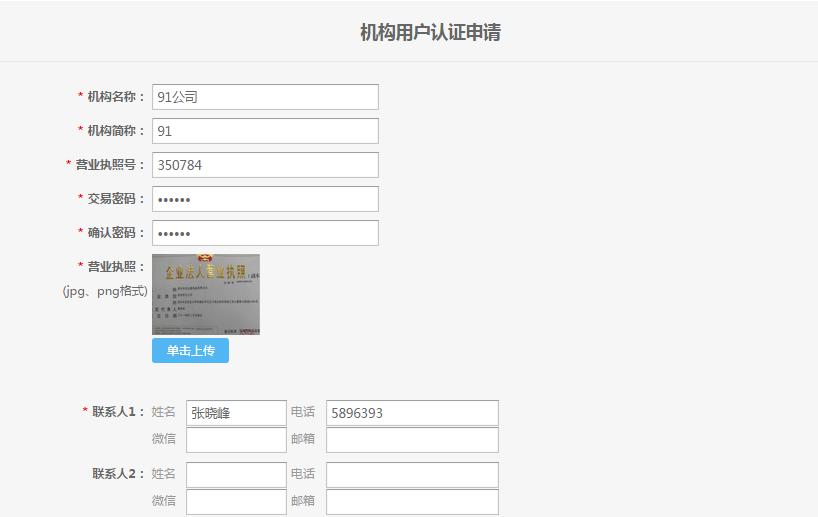 2.进入申请页面后,输入机构名称、机构简称、营业执照号(唯一)等带*的必填项,勾选《服务协议》和《风险揭示书》,点击提交。身份认证成功提交,进入审核状态。如下图所示: