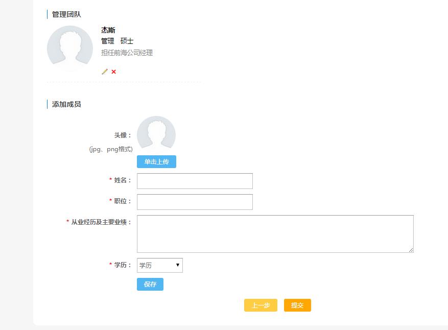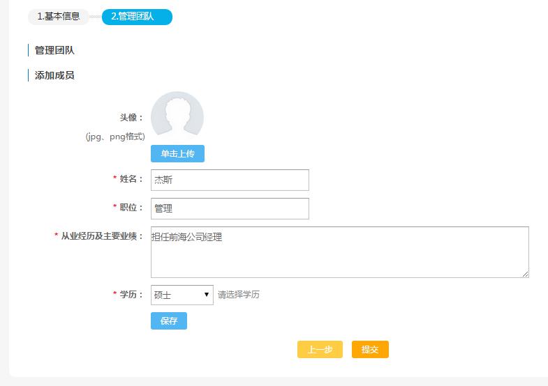 2.进入基本信息界面,上传头像,选择地区、投资意向行业等带*的必填项,勾选《服务协议》和《风险揭示书》,进入下一步,填写管理团队信息,上传头像,填写姓名、职位等带*的必填项,点击保存,保存管理团队信息成功(可以添加多个管理团队),点击提交,进入审核状态。如下图所示: